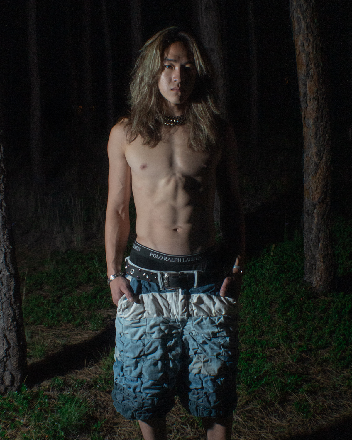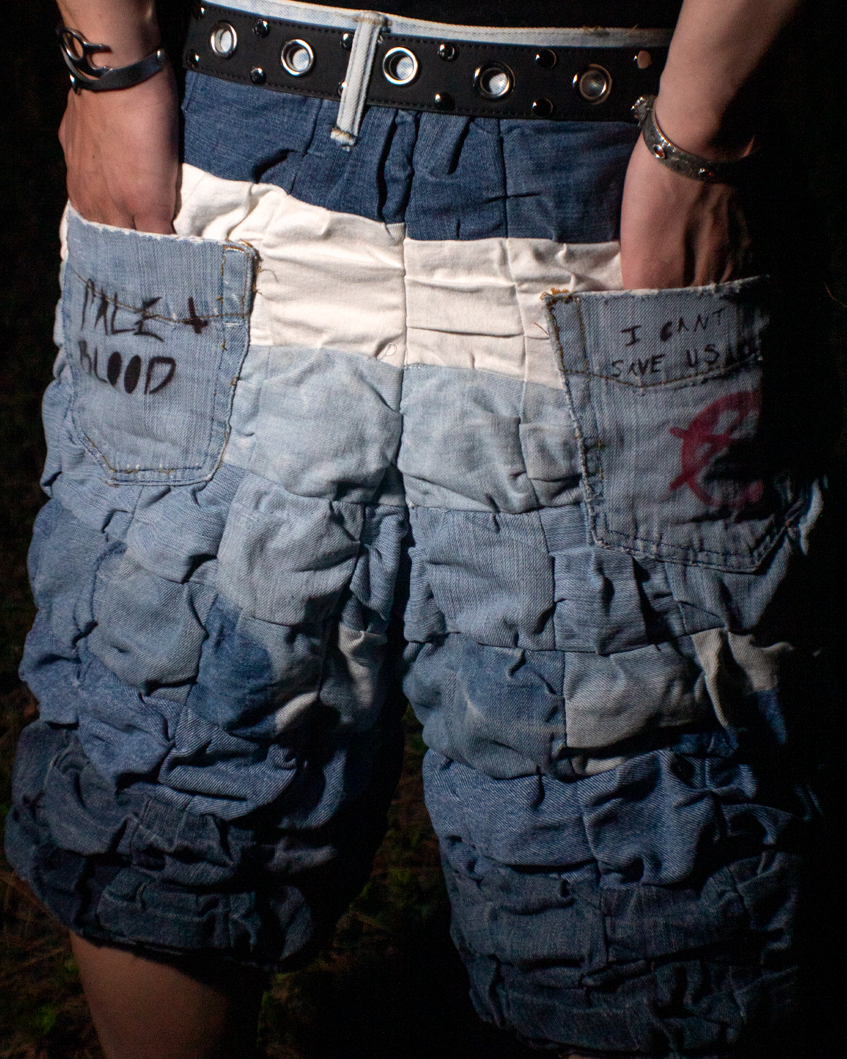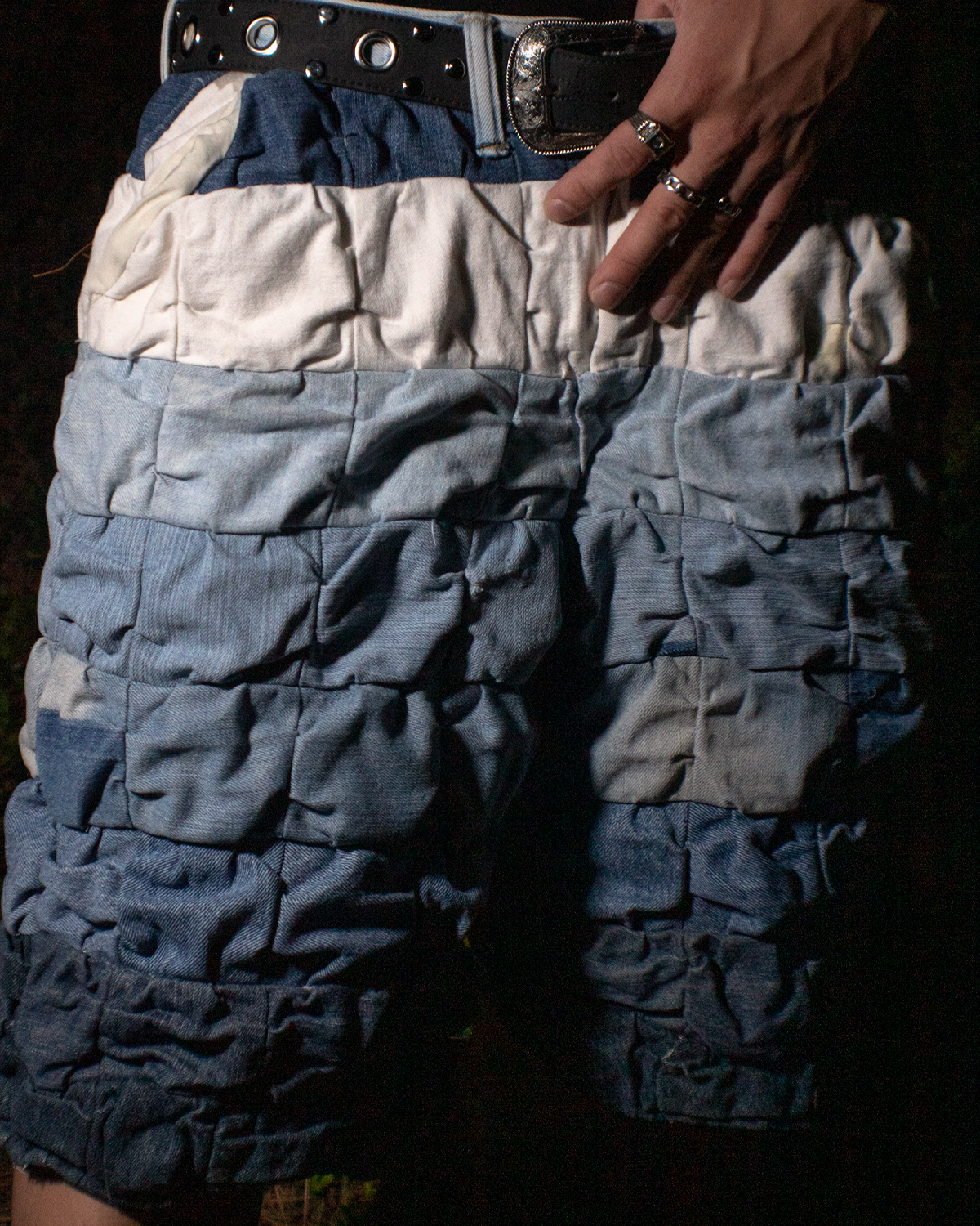 These fabric-manipulated jorts were developed through an upcycling process that transforms reclaimed denim into a new, constructed textile before garment assembly. Small denim squares were cut, pleated, and individually sewn together to create a modular fabric surface, which was then patterned and constructed into pants. The resulting piece emphasizes structure, repetition, and controlled volume. Over time, the garment evolves through wear and washing. What begins as a more architectural, pleated form gradually softens as the pleats relax, allowing the pants to expand in volume and shift in silhouette. This transformation highlights the relationship between material behavior, time, and use—positioning the garment as a living piece rather than a static design. The project was fully self-directed, encompassing material development, patternmaking, construction, modeling, and visual documentation. Through this process, the jorts function as both a study in textile manipulation and an exploration of how upcycled materials can gain dimensionality and character through everyday interaction.
